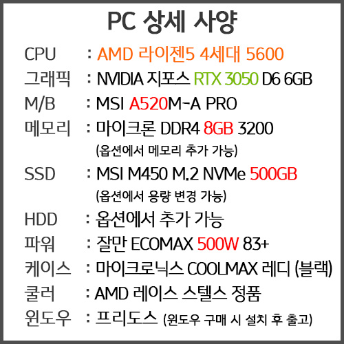 구매하기 윈도우 선택 옵션 선택 프리도스 (윈도우 직접 설치) 윈도우 11 DSP 추가 (설치 후 출고) 윈도우 11 FPP 추가 (설치 후 출고) + 추가 옵션 선택 메모리 추가 옵션 선택 DDR4 8G 추가(+70,000) SSD 변경 옵션 선택 SSD 1TB로 변경(+55,000) HDD 추가 옵션 선택 씨게이트 바라쿠다 1TB 추가(+120,000) 씨게이트 바라쿠다 2TB 추가(+140,000) 씨게이트 바라쿠다 4TB 추가(+180,000) 씨게이트 바라쿠다 8TB 추가(+270,000) 총 금액 0 원 장바구니 구매하기
