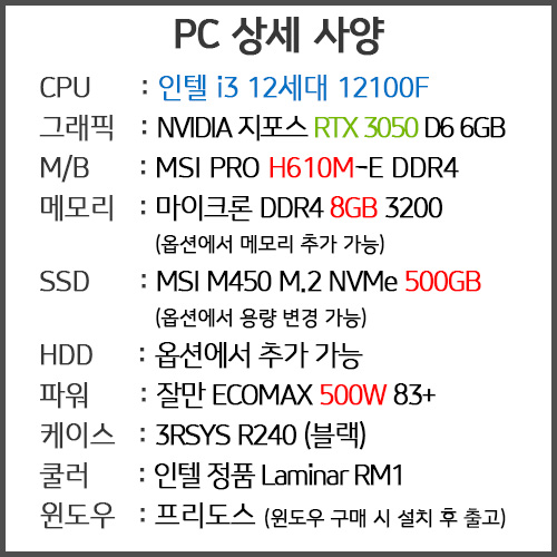 구매하기 윈도우 선택 옵션 선택 프리도스 (윈도우 직접 설치) 윈도우 11 DSP 추가 (설치 후 출고) 윈도우 11 FPP 추가 (설치 후 출고) + 추가 옵션 선택 메모리 추가 옵션 선택 DDR4 8G 추가(+70,000) SSD 변경 옵션 선택 SSD 1TB로 변경(+55,000) HDD 추가 옵션 선택 씨게이트 바라쿠다 1TB 추가(+120,000) 씨게이트 바라쿠다 2TB 추가(+140,000) 씨게이트 바라쿠다 4TB 추가(+180,000) 씨게이트 바라쿠다 8TB 추가(+270,000) 총 금액 0 원 장바구니 구매하기