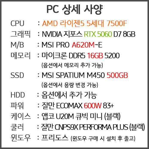 AMD 라이젠5 7500F + RTX 5060 게이밍 조립컴퓨터