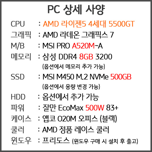 구매하기 윈도우 선택 옵션 선택 프리도스 (윈도우 직접 설치) 윈도우 11 추가 (설치 후 출고) + 추가 옵션 선택 메모리 추가 옵션 선택 DDR4 8G 추가(+70,000) SSD 변경 옵션 선택 SSD 1TB로 변경(+55,000) HDD 추가 옵션 선택 씨게이트 바라쿠다 1TB 추가(+120,000) 씨게이트 바라쿠다 2TB 추가(+140,000) 씨게이트 바라쿠다 4TB 추가(+180,000) 씨게이트 바라쿠다 8TB 추가(+270,000) 총 금액 0 원 장바구니 구매하기