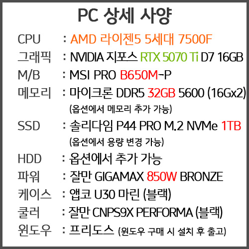 구매하기 윈도우 선택 옵션 선택 프리도스 (윈도우 직접 설치) 윈도우 11 DSP 추가 (설치 후 출고) 윈도우 11 FPP 추가 (설치 후 출고) + 추가 옵션 선택 메모리 추가 옵션 선택 마이크론 DDR5 16G 추가(+140,000) SSD 변경 옵션 선택 SSD 2TB로 변경(+99,000) HDD 추가 옵션 선택 씨게이트 바라쿠다 1TB 추가(+120,000) 씨게이트 바라쿠다 2TB 추가(+140,000) 씨게이트 바라쿠다 4TB 추가(+180,000) 씨게이트 바라쿠다 8TB 추가(+270,000) 총 금액 0 원 장바구니 구매하기