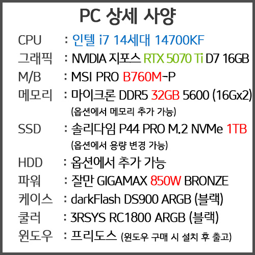구매하기 윈도우 선택 옵션 선택 프리도스 (윈도우 직접 설치) 윈도우 11 DSP 추가 (설치 후 출고) 윈도우 11 FPP 추가 (설치 후 출고) + 추가 옵션 선택 메모리 추가 옵션 선택 삼성전자 DDR5 16G 추가(+190,000) SSD 변경 옵션 선택 SSD 2TB로 변경(+99,000) HDD 추가 옵션 선택 씨게이트 바라쿠다 1TB 추가(+120,000) 씨게이트 바라쿠다 2TB 추가(+140,000) 씨게이트 바라쿠다 4TB 추가(+180,000) 씨게이트 바라쿠다 8TB 추가(+270,000) 총 금액 0 원 장바구니 구매하기