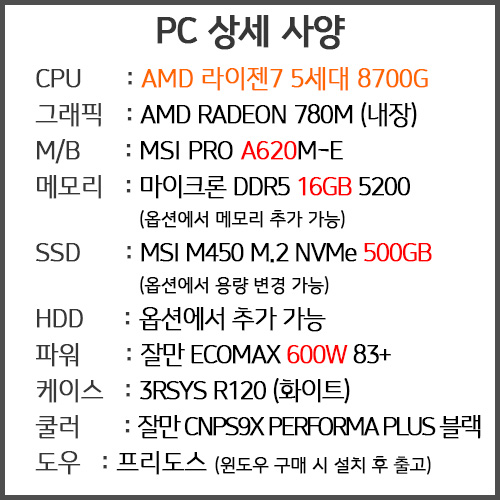 구매하기 윈도우 선택 옵션 선택 프리도스 (윈도우 직접 설치) 윈도우 11 DSP 추가 (설치 후 출고) 윈도우 11 FPP 추가 (설치 후 출고) + 추가 옵션 선택 메모리 추가 옵션 선택 DDR5 16G 추가(+140,000) SSD 변경 옵션 선택 SSD 1TB로 변경(+55,000) HDD 추가 옵션 선택 씨게이트 바라쿠다 1TB 추가(+120,000) 씨게이트 바라쿠다 2TB 추가(+140,000) 씨게이트 바라쿠다 4TB 추가(+180,000) 씨게이트 바라쿠다 8TB 추가(+270,000) 총 금액 0 원 장바구니 구매하기